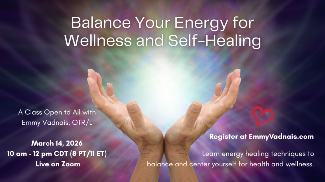 Balance Your Energy for Wellness and Self-Healing Class Instructor: Emmy Vadnais, OTR/L Location: Zoom Date: March 14, 2026 Time: 10 am – 12 pm CDT (11 am ET/8 am PT) REGISTER HERE All are welcome. Please join me on Saturday, March 14. In this class, you will learn energy healing techniques to balance and center yourself for health and wellness. You will be guided in meditations and energy healing practices, such as a heaven-earth meditation, aura and chakra balancing, and positive emotional freedom technique (EFT). You will learn and experience positive energy psychology methods that can calm the mind-body-spirit, boost the mood, enhance self-compassion and self-love, and assist with your health and wellness. These…